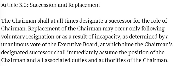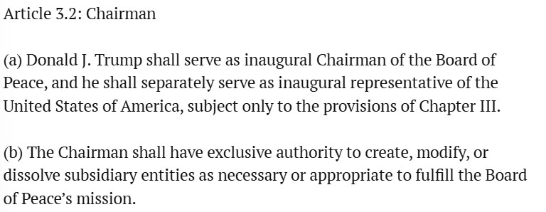 Dat betekent dat als Trump ooit president-af zou worden, dat hij hoogstpersoonlijk voorzitter zal blijven van de ‘Vredesraad’. Zijn opvolger mag hij zelf aanwijzen. Alleen een unanieme stemming van de Uitvoerende Raad (die door Trump wordt benoemd) mag de voorzitter afzetten.