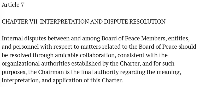 Het handvest van de ‘Vredesraad’ geeft Trump ook de macht om subcomité’s te organiseren en eenzijdig hun mandaat en structuur te bepalen. Dat zou ter vervanging kunnen zijn van UNESCO, Rode Kruis, UNRWA, het Mensenrechtencomité, of het Internationaal Gerechtshof, om maar wat te noemen.