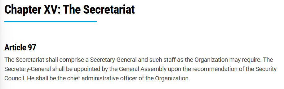 Bij de Verenigde Naties gaat dit anders. Daar wordt de secretaris-generaal gekozen door de algemene vergadering, waar alle landen samenkomen. Die secretaris-generaal kan alleen maar de resoluties uitvoeren die de algemene vergadering aanneemt, en is dus vooral uitvoerder, geen wetgever.