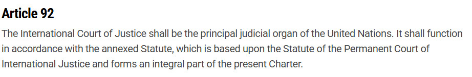 Bij conflicten kunnen landen terecht bij de algemene vergadering of bij de Veiligheidsraad, of bij het Permanente Hof van Arbitrage of het Internationaal Gerechtshof. Uiteindelijk bepalen de rechters van het Gerechtshof over de uitleg van het VN-handvest.