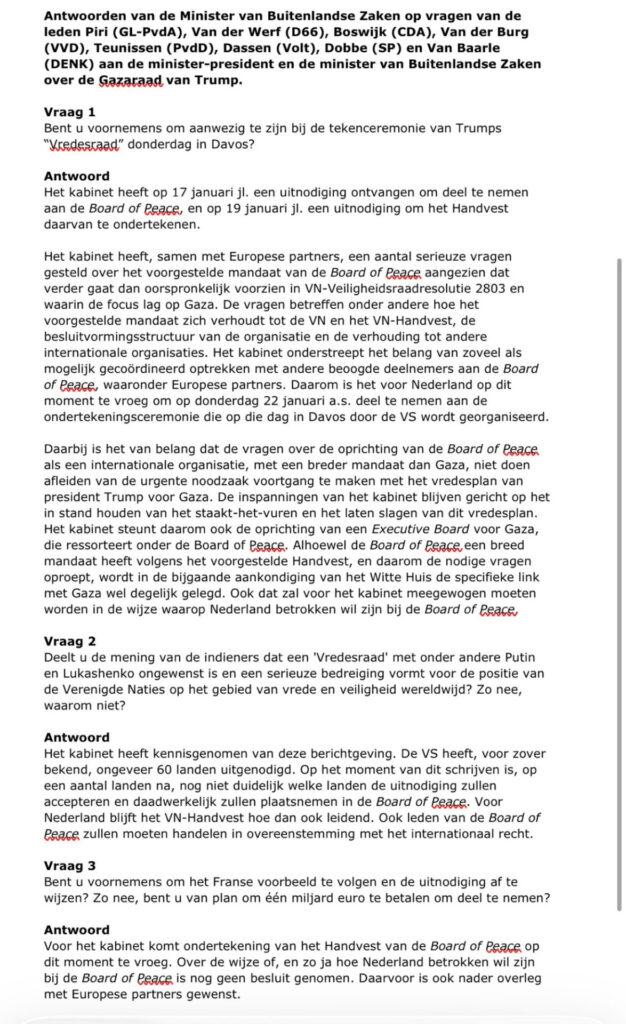 Wat is die ‘Vredesraad’? Oorspronkelijk is de ‘Vredesraad’ (Board of Peace) onderdeel van het Amerikaanse plan voor Gaza. In november vorig jaar heeft de VN-Veiligheidsraad ingestemd met het instellen van de ‘Vredesraad’, met carte blanche om Gaza te regeren (zie OC 4 onder B).