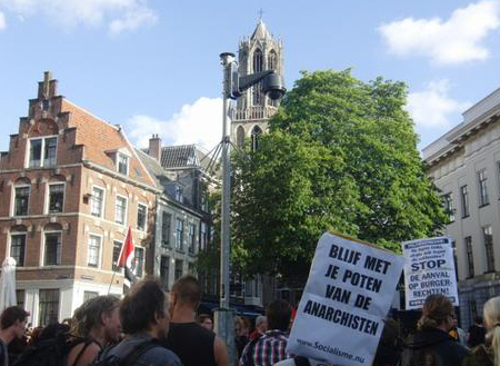 Maar het was niet enkel libertair-revolutionaire deelname wat de klok sloeg. Een SP-gemeenteraadslid – iemand die, zoals ik had gezien, door grof duwende politie op 1 mei ervan was weerhouden om zich toen bij de optocht te voegen – was ook onder de demonstranten. En de Internationale Socialisten (IS) waren er met een flink groepje, met flyers voor hun Marxisme-festival, met hun blad en met een handvol borden. “Politierepressie: nu tegen links, straks ook tegen de vakbonden? Stop de aanval op burgerrechten”; “Investeren in onderwijs, niet in onderdrukking” (als ik het goed zag), en ook het wel aandoenlijk lieve: “Blijf met je poten van de anarchisten”. Ze moeten natuurlijk ook met hun poten van de trotskisten afblijven, en van iedereen die in verzet probeert te komen. Maar de speciale aandacht vond ik toch ook wel weer aardig. En best goed dat de IS het niet bij een online pro forma-steunoproep had gelaten, maar echt werk had gemaakt van haar deelname. Van enkele andere groepen die hadden opgeroepen zag ik helaas geen zichtbare deelname. Daaronder onder meer Socialistisch Alternatief, waarvan op 1 mei juist wel nadrukkelijk mensen meededen.