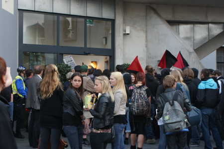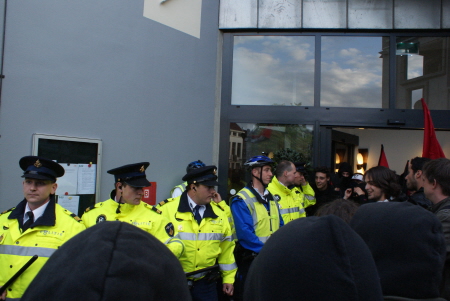 De groep verwijderde zich voor een deel van de ingang – totdat daar opeens rumoer was. Er stond opeens een tiental agenten, agressieve uitstraling, knuppel gereed, voor de ingang. Die moest vrijgehouden worden, of zoiets. Even later, na dreigende gebaren van hun kant en heftig geroep van de onze, verplaatste het politiegroepje zich, en er verscheen een politielinie van enkele tientallen agenten aan de zijkant van het plein achter het stadhuis waar de actie plaatsvond. Weer leuzen roepen: “Schande!”, “Zoek een baan”.