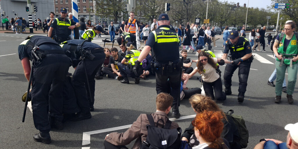 Kortom, de situatie was behoorlijk chaotisch in vergelijking met een blokkade waarbij iedereen of in elk geval een groot deel van de activisten op de A12 zit. Gaandeweg werd duidelijk dat er ook op andere plekken kruispunten en wegen werden geblokkeerd. Dat was voor de politie een lastige zaak, en een deel van de agenten reageerde dan ook behoorlijk opgefokt en geagiteerd, wat leidde tot fors politiegeweld.