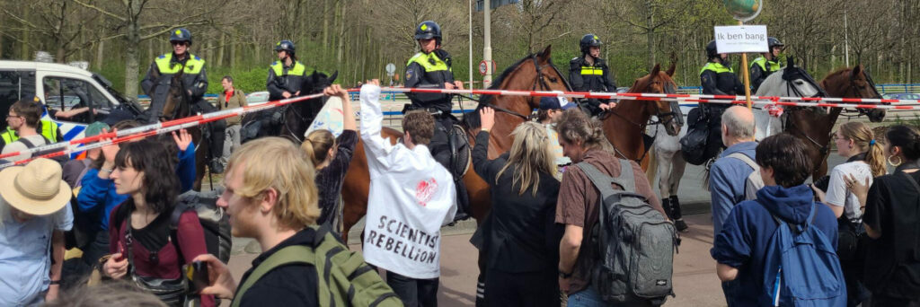 In de buurt van de A12 was de politie ook nadrukkelijk aanwezig. De activisten, waaronder ook een van ons, die zich aan de rand van het Malieveld hadden verzameld om de A12 op te gaan, werden tegengehouden door een flinke politiemacht. Het was toen al duidelijk dat het die zaterdag niet zou gaan lukken om met een grote groep de A12 te blokkeren.