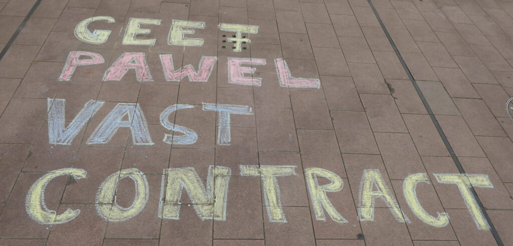 Het is ontzettend belangrijk dat zoveel mensen hem kwamen steunen: collega’s en andere FNV-ers en activisten. Enkele collega’s vertelden dat zij inmiddels een vast contract hebben, dankzij de strijd die Paweł mede organiseerde. Paweł is een echte vakbondsleider. Hij nam het op voor zijn collega’s. Hij deed zijn mond open, waar anderen tot nu toe zwegen. En precies dat kon Albert Heijn niet verkroppen. En daarom zijn de FNV en organisaties als Doorbraak de campagne #Justice4Paweł begonnen.