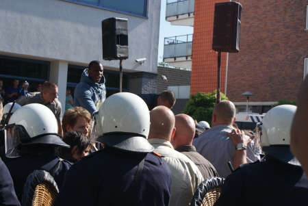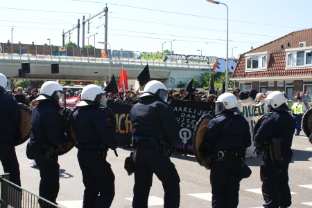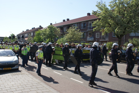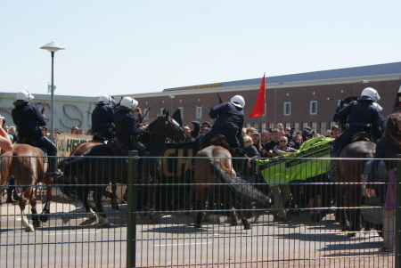 De demonstranten worden al snel tegengehouden Tegen 14:30 uur lijkt de demonstratie uiteindelijk van start te mogen gaan. Maar al snel blokkeren politie en ME de route. Blijkbaar heeft een van de 250 demonstranten een sjaaltje voor de mond, en dat mag niet van de politie, terwijl hun collega’s van de ME met bivakmuts en integraalhelm de hele stoet omsingeld houden. Na wederom een hoop gesteggel mag de demonstratie weer verder, althans voor een paar meter. Weer worden de demonstranten ingesloten door politie, ME en politie te paard. De ME deelt een hoop klappen uit. Een van de spandoeken blijkt namelijk nog steeds in de lucht gehouden te worden door een paar houten latjes van één centimeter dik. De knuppels van de ME en de politie zijn veel dikker. Dat ondervinden veel demonstranten. Ondertussen zijn een hoop buurtbewoners komen kijken. De meesten van hen vinden het politieoptreden zwaar overdreven. Op het moment dat de demonstranten joelen dat ze verder willen lopen, joelen en klappen ook omstanders mee. Enkele van de omstanders worden meteen hardhandig gearresteerd, alsmede een fotograaf die een vuistslag in zijn gezicht krijgt.