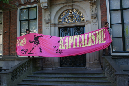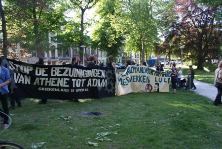 Wat voorbeelden van spandoeken.Agenten in burger gaan als beesten tekeer op het mobiele podium van de demonstranten.De demonstratie loopt weer verder.De Kritische Studenten Utrecht ontvouwen een spandoek. De demonstratie eindigt in een park.