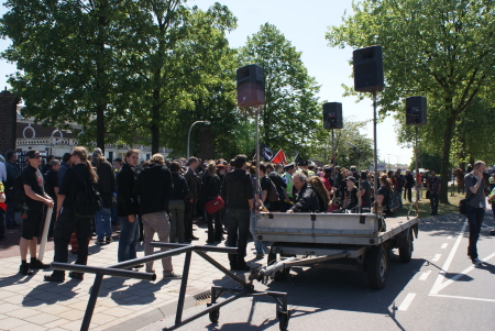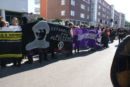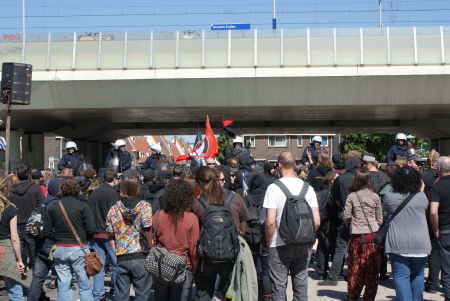 Blokkade aan het begin van de demonstratie.1 mei 2011. Utrecht. Zo’n 250 mensen vieren de Dag van de Arbeid. Onder hen bevinden zich mensen vanuit anarchistische hoek, Doorbraak, Socialistisch Alternatief, Anti-Fascistische Aktie (AFA) Nederland, Kritische Studenten Utrecht (KSU), de Internationale Socialisten (IS) en de Internationale Kommunistische Stroming (IKS). De dag moet er een zijn van feest, solidariteit en verzet. Een dag uit solidariteit met al diegenen die verwikkeld zijn in de sociale strijd. Een dag waarop een verbond van jongeren, studenten, arbeiders, migranten en uitkeringsgerechtigden een strijdbare demonstratie organiseren voor een radicaal andere samenleving. De demonstratie is georganiseerd door een aantal anarchistische groepen en Doorbraak en begint om 14:00 uur bij het station Utrecht Zuilen en moet richting de binnenstad gaan.