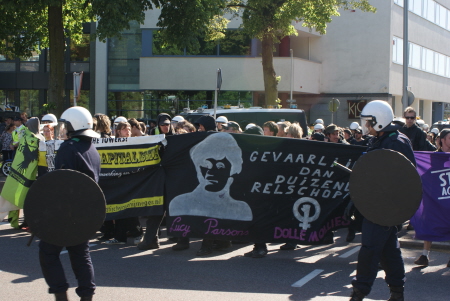 De demonstranten verzamelen zich De politie en gemeente Utrecht denken daar echter geheel anders over. Zij willen geen demonstratie, zij willen geen vrijheid van meningsuiting, zeker niet als die uit linkse hoek komt. Van meet af aan poogt de politie het protest de kop in te drukken. Demonstranten onderweg naar het protest worden lastig gevallen door de massaal uitgerukte en agressieve politie. De inzittenden van een bus uit Arnhem en Nijmegen mogen zich geruime tijd niet bij de demonstranten vervoegen, omdat ze vlaggen bij zich hebben. De politie deelt hierbij de eerste klappen uit. Spandoeken breder dan 1,5 meter blijken tegenwoordig ook al verboden te zijn. Na een hoop gesteggel mogen die laatsten nog wel meegevoerd worden, mits ontdaan van de stokken, ook al zijn die niet dikker dan een cocktailprikker.