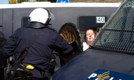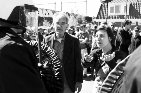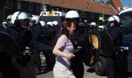 Een demonstrante pleit voor een oudere kameraad die van de ME de demonstratie niet uit mag.“Wij hebben mogen ervaren dat het gedurende grote delen van de demonstratie voor mensen ‘buiten de demonstratie’ onmogelijk was zich aan te sluiten”, stellen de raadsleden, “terwijl het voor mensen in de demonstratie onmogelijk was eruit te stappen. In beide gevallen werd men met het nodige geduw en getrek door ME-ers tegengehouden. Moet naar de mening van het college in een democratisch land een individu niet altijd de mogelijkheid hebben zich bij een demonstratie aan te sluiten (om te laten merken dat men de mening van de betogers deelt) of om een betoging juist te verlaten?” Helaas bekritiseren de raadsleden in hun vragen niet het schofterige politiegeweld dat tot veel gewonden leidde, en ook niet de massale inzet van stillen, agenten in burgerkleding.