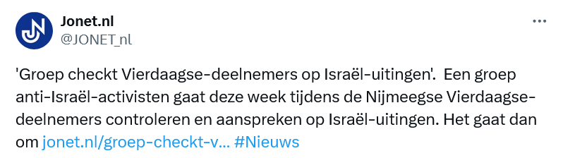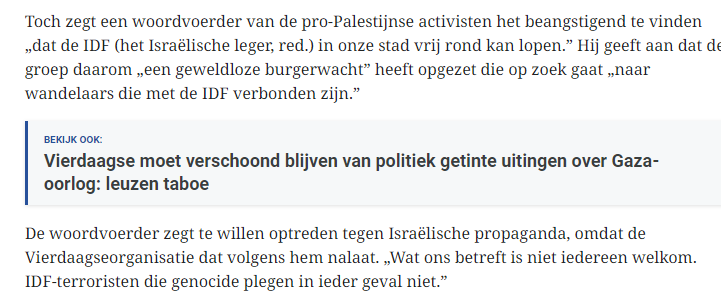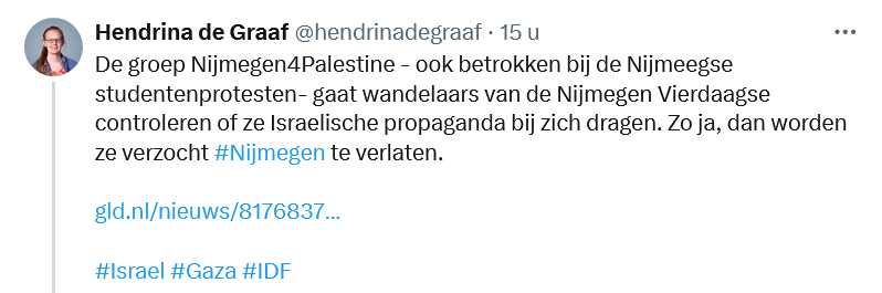 De ophef komt van een Telegraaf-artikel van gisteravond. Daarin wordt omschreven hoe een groep activisten mensen wil gaan aanspreken als ze legertekens van het Israëlische leger dragen. Dat is alles. Dat is de storm in een glas water.