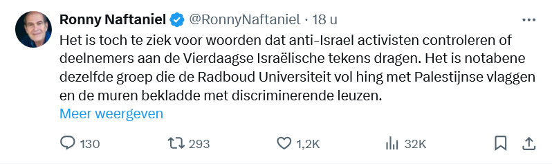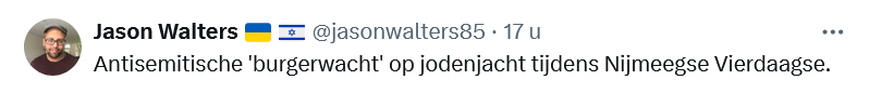 “Pro-Palestijnse ’burgerwacht’ controleert lopers Vierdaagse op legertekens Israël”, kopte De Telegraaf gisteren. VVD-Kamerlid Ulysse Ellian, de zoon van de extreem-rechtse opiniemaker Afshin Ellian, reageerde meteen op Twitter: “‘Burgerwacht’? Iedereen snapt de intentie hiervan: namelijk mensen die openlijk Joods zijn of Israël steunen intimideren. Wegwezen met deze ‘burgerwacht’ die doet denken aan de Sturmabteilung. En nee, dit heeft niks meer te maken met het opkomen voor Palestijnen.”