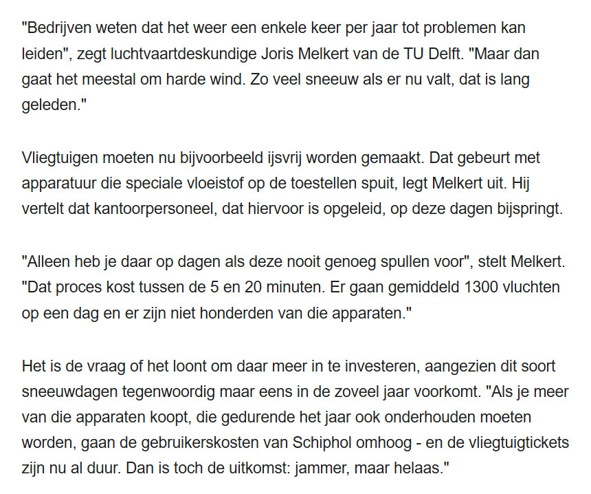 Dit geldt ook voor bijvoorbeeld Schiphol: daar investeren ze minder in het ijsvrij maken van vliegtuigen. Dan doen ze een beroep op de kaartprijs, maar uiteindelijk gaat het natuurlijk vooral om de winstmarge. Hoe minder onderhoud, hoe meer winst.