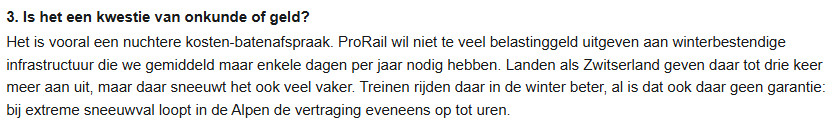 En ook bij het spoor gaat het om een besparingsslag (of zoals ProRail het noemt: een kosten-batenanalyse). ProRail wil niet te veel geld uitgeven aan iets dat maar enkele dagen per jaar een voordeel geeft, zoals verwarmde wissels.