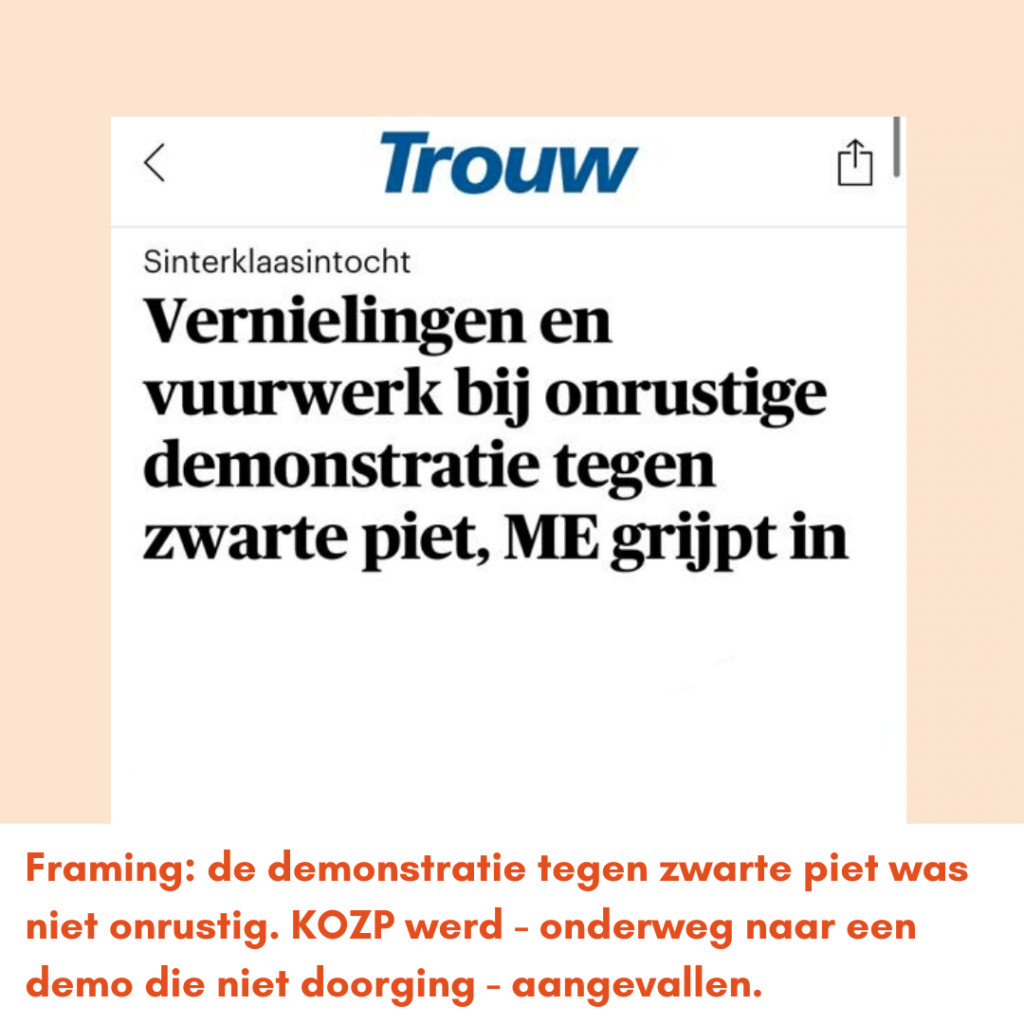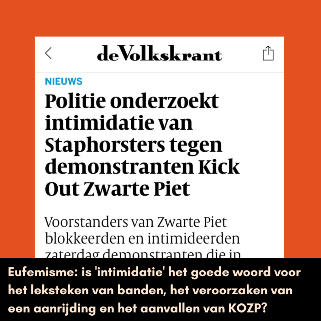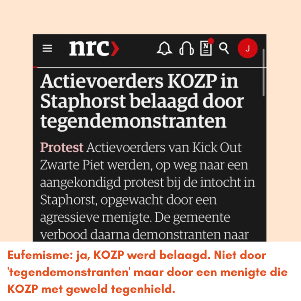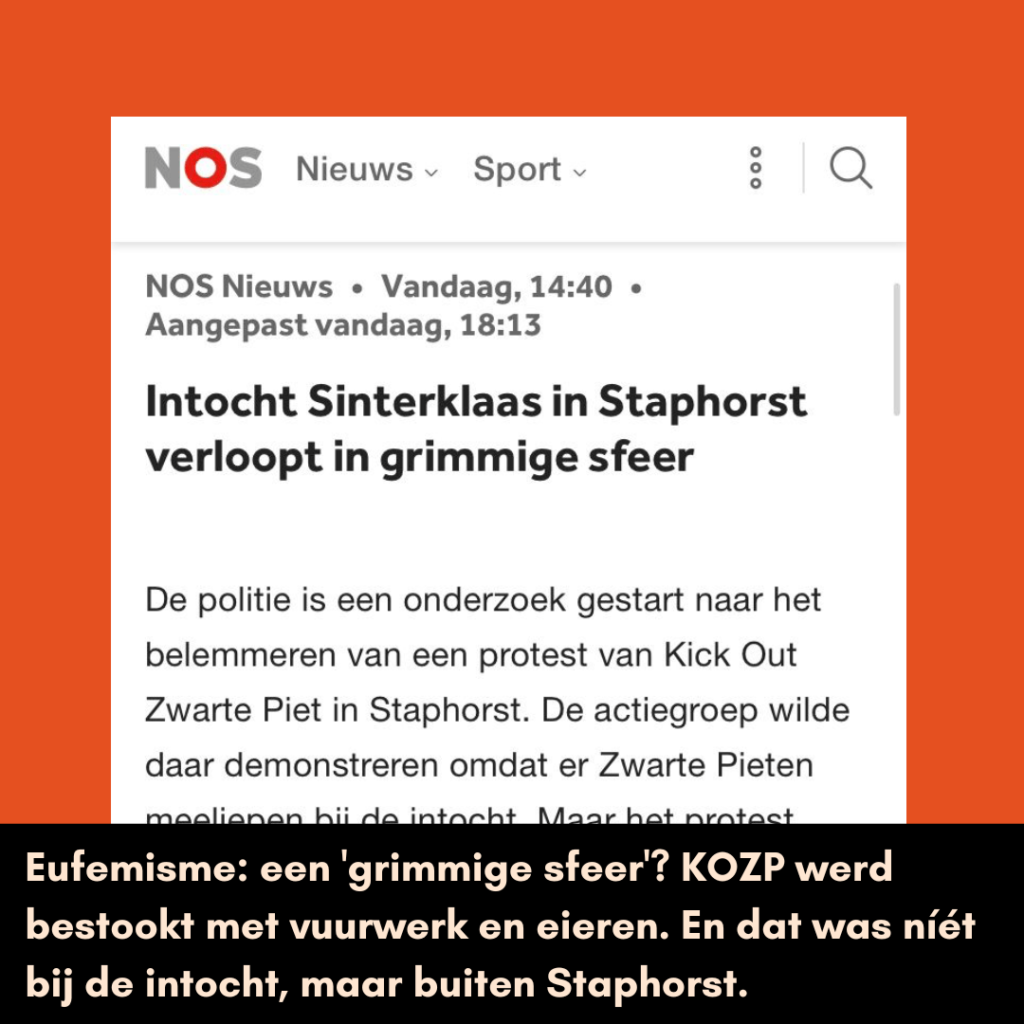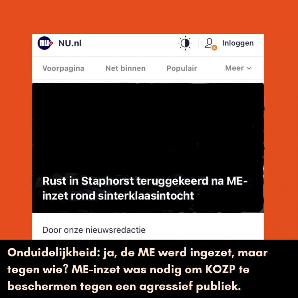 Tijdens de poging tot demonstratie van afgelopen zaterdag in Staphorst, 19 november 2022, waren er wederom veel voorbeelden van misleidende, incomplete of anderszins niet kloppende berichtgeving. We maken een rondje langs de koppen van grote media afgelopen weekend om te kijken hoe verslag werd gedaan van de gebeurtenissen. Verschillende dingen vallen op. Er worden woorden en uitdrukkingen gebruikt die verdoezelen of verzachten wat er is gebeurd, bijvoorbeeld: “onrust” (KOZP werd aangevallen en bekogeld met vuurwerk, banden werden lek gestoken), “grimmige sfeer” (nogmaals: er waren aanvallen van racisten tegen KOZP, met brandstof, eieren en vuurwerk) of “tegendemonstranten” (er waren geen tegendemonstranten, er was een racistische en agressieve menigte die met geen enkel ander doel kwam dan KOZP tegenhouden). Er worden formuleringen gebruikt waarbij het onduidelijk of zelfs misleidend is wie de agressor is, bijvoorbeeld: “confrontaties” (KOZP deed niets anders dan in auto’s naar het aangewezen demonstratievak rijden, toen ze werden aangevallen) of de opsomming van “geweld”, “bedreiging, vernieling en diefstal” zonder dat vermeld wordt wíé er gewelddadig zijn, bedreigen, vernielen en stelen. Er wordt niet duidelijk gemaakt waarom of tegen wie politie en ME zijn ingezet, bijvoorbeeld: “Rust teruggekeerd na inzet ME” (maar waarom en tegen wie moest de ME ingezet worden?), “Politie grijpt in” (maar waarom en tegen wie grijpt de politie in?).