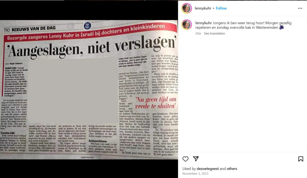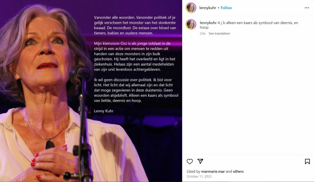 Lenny Kuhr is niet verantwoordelijk voor wat de israelische regering doet. Ze is zelfs niet stemgerechtigd in Israël. Ze is ook niet verantwoordelijk voor de opinie van haar dochter. Ze is geen “influencer” met tigduizend hehoorzame volgers. Kennelijk vindt ze het doden van Israeli’s door Hamas erger dan het doden van palestijnen door Israel. Betekent dat dat ze zelf terrorist is? Volgens mij ben je dat pas als je dodelijk geweld tegen burgers gebruikt of er mee dreigt om (politiek) je zin te krijgen.