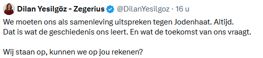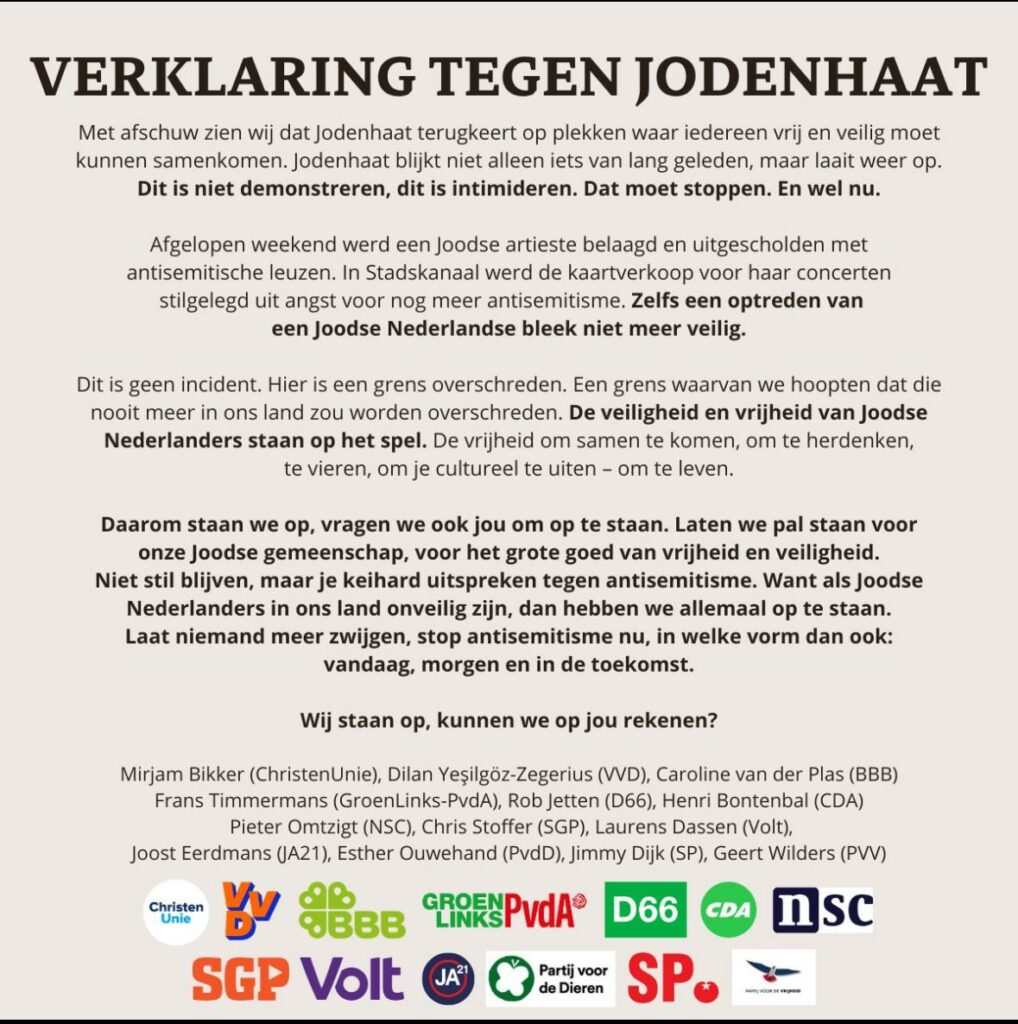 Allereerst moet gezegd worden dat antisemitisme verwerpelijk is en bestreden moet worden. Daarover zijn we het eens. Of, nou ja, we zijn het blijkbaar oneens. Dat JA21 deze verklaring mag onderteken, is abject. Ik ben tegen antisemitisme, JA21 is tegen Palestijnen. Groot verschil.