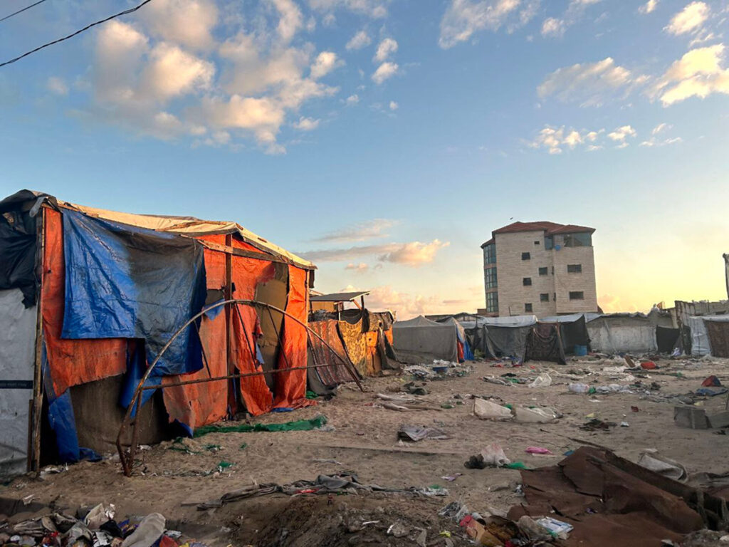 Tenten bij gebombardeerde gebouwen, februari 2025. (Foto: Hla.bashbash/CC: BY-SA)