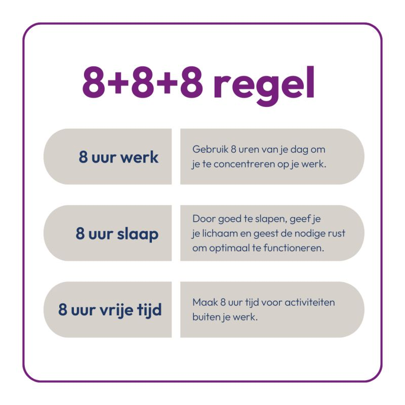 In theorie heb je met een achturige werkdag ook acht uur slaap en acht uur vrije tijd, maar iedereen weet dat dat puur theoretisch is. Zoals gezegd heb ik negen uur slaap nodig. Ik moet opstaan, klaarmaken, reizen (heen en terug), eten, klaarmaken voor slaap…