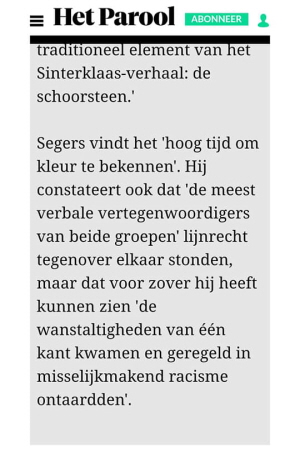 Het eerste artikel gaat over Dijkhoff die het liefst wil dat demonstraties tijdens Sinterklaasintochten verboden worden. Daaronder is Segers geciteerd die voor roetveegpieten is.