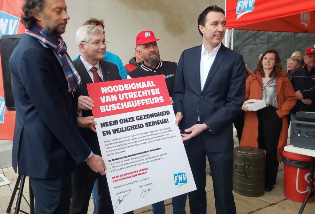 Het is al een paar maanden een zooitje in het Utrechtse streekvervoer, sinds de bedrijven Transdev en Keolis de verantwoordelijkheid hebben voor het openbaar vervoer in die provincie. De dienstregeling is een ramp voor de buschauffeurs, die ook nog eens worden geconfronteerd met slecht onderhoud van de bussen en met een hoop frustratie en agressie van reizigers. De chauffeurs worden soms zelfs bespuugd en geslagen. Daarom waren veel buschauffeur vanmorgen voor de ingang van het Provinciehuis bijeengekomen om een “noodsignaal” af te geven aan het provinciebestuur. Die noodkreet, die de vorm had van een grote brandbrief in kunststof, werd door een vertegenwoordiger van de buschauffeurs overhandigd aan André van Schie, VVD-er en lid van Gedeputeerde Staten met “mobiliteit” in zijn portefeuille.