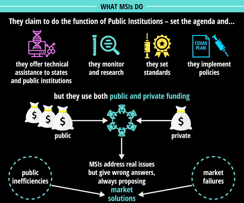 De Covax is een MultiStakeholder Initiative (MSI), een organisatie waarin bedrijfsleven, wetenschap, en filantropische en sociale organisaties samenwerken. Dat klinkt mooier dan het is, want MSI’s worden meestal door het bedrijfsleven opgericht, de leden ervan worden door de organisator bij elkaar gezocht en het is dan ook niet verwonderlijk dat het bedrijfsleven uiteindelijk bepaalt wat er wel en niet gebeurt, ook al zitten er een paar vertegenwoordigers van sociale organisaties mee aan tafel.